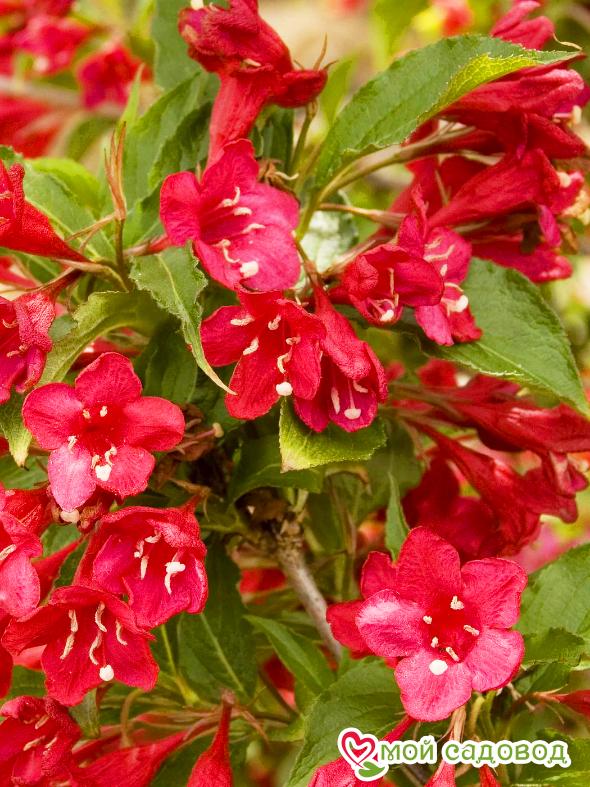 Вейгела Ред Принц (Weigela hybrida Red Prince) — невысокий раскидистый кустарник до 1,5м высотой и до 1,5м шириной. Цветет обильно в июне. Цветки многочисленные, колокольчатые, ярко-красные до 3,5см длиной, не выгорающие на солнце, собраны в соцветия по 3–4 шт., появляются на побегах прошлого года. Листья насыщенного зеленого цвета. Ежегодный прирост около 20 см. Повторное цветение в конце августа – начале сентября. Любит солнечные места, плодородные дренированные почвы. Уход за растением:  Саженцы вейгелы нужно сажать в плодородную, воздухопроницаемую почву. Сразу учитывайте, что место постоянное, так как пересадить массивный куст с пышной кроной даже при желании будет практически невозможно. Для того, чтобы растение выглядело аккуратно, его нужно стричь, удаляя больные и поврежденные ветки и формируя крону так, как вам это нужно. В первый сезон кустарник нуждается в регулярном поливе, затем вейгелу поливают только при длительных засухах.